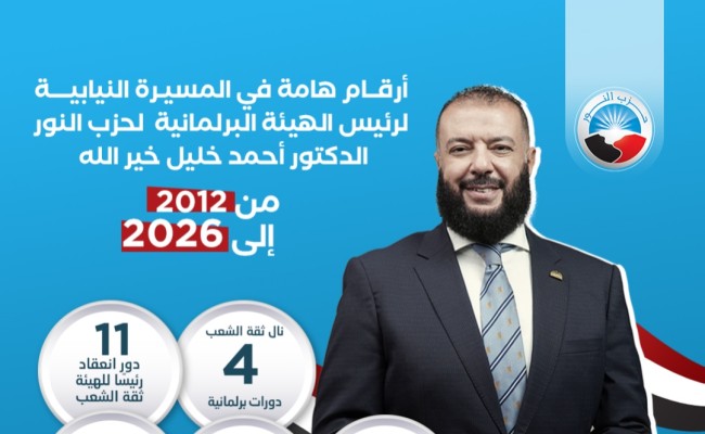 انفوجراف| أرقام هامة في المسيرة النيابية لرئيس الهيئة البرلمانية لحزب النور الدكتور أحمد خليل خير الله