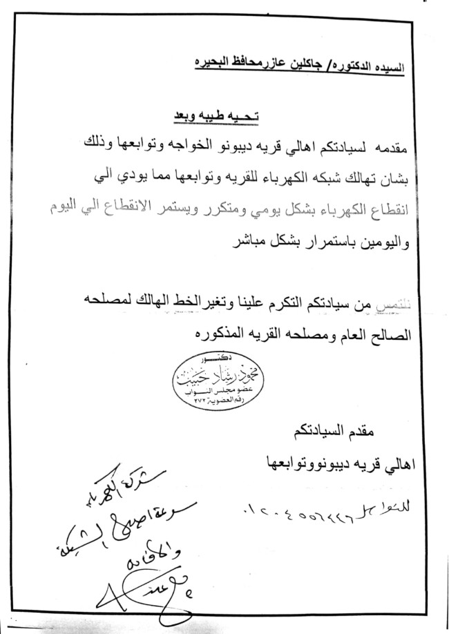 في استجابة سريعة لمطالب أهالي مركز ادكو، وافقت الدكتورة جاكلين عازر محافظ البحيرة على الطلب المقدم من النائب الدكتور محمود رشاد حبيب، عضو مجلس النواب، بشأن معالجة أزمة تهالك شبكة الكهرباء بقرية ديبونو الخواجة وتوابعها، حيث تضمن الطلب رصداً للمعاناة اليومية التي يواجهها سكان القرية جراء الانقطاع المتكرر والمستمر للتيار الكهربائي والذي وصل في بعض الأحيان إلى يومين متواصلين نتيجة تدهور حالة الخطوط.