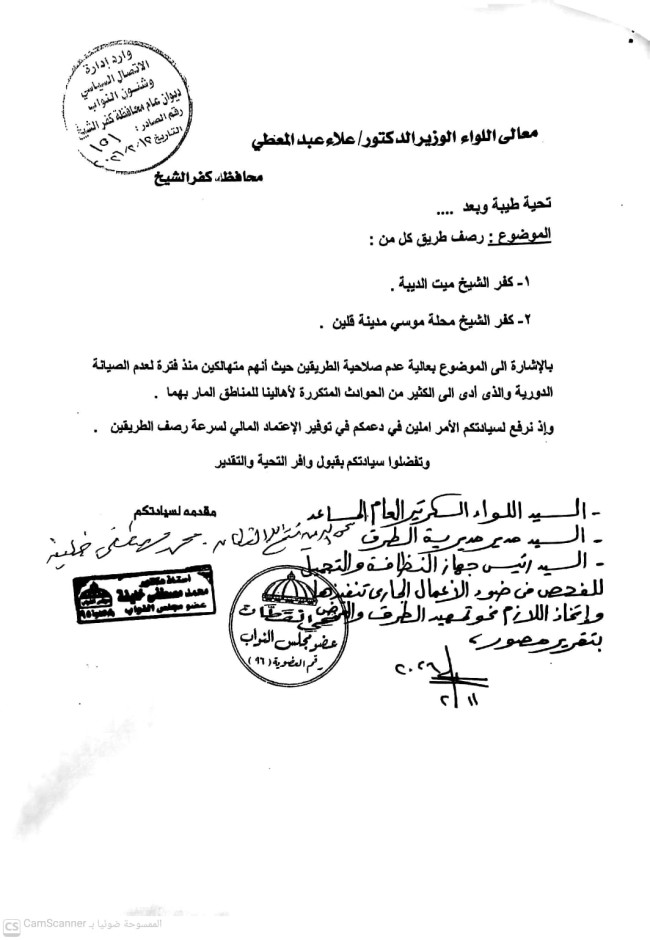 تقدم الأستاذ الدكتور محمد مصطفى خليفة، عضو مجلس النواب عن دائرة كفر الشيخ وقلين، بطلب رسمي إلى محافظ كفر الشيخ، بشأن الموافقة على رصف طريقين حيويين بالدائرة، وهما طريق (كفر الشيخ - ميت الديبة) وطريق (كفر الشيخ - محلة موسى - مدينة قلين).