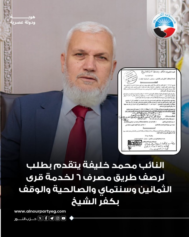 في إطار جهوده المستمرة لتطوير البنية التحتية بمركز كفر الشيخ، تقدم الأستاذ الدكتور محمد مصطفى خليفة، عضو مجلس النواب عن دائرة كفر الشيخ وقلين، بطلب رسمي بضرورة رصف الطريق الموازي لمصرف6 بطول 3كم، والذي يمثل شريانًا حيويًا يربط قرى الثمانين وسنتماي والصالحية والوقف ومنطقة الكوم الطويل وأبو كلبوش والخادمية بطريق كفر الشيخ بلطيم، موضحًا أن هذا الطريق يخدم قطاعًا عريضًا من أهالي هذه القرى والمناطق المجاورة لها من أصحاب الأراضي الزراعية.
