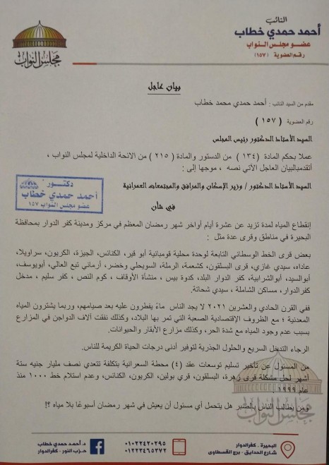 "حمدى": طلب إحاطة عاجل لانقطاع المياه بكفر الدوار..ويؤكد نفوق الدواجن والمواشي دون جدوي من المسئولين