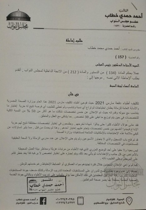 بالمستندات| "حمدي" ينشر توصيات لجنة الصحة بالبرلمان بشأن مشكلة تكليف أطباء ٢٠٢١